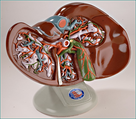 dissected to expose major blood vessels and bile ducts in deep relief.