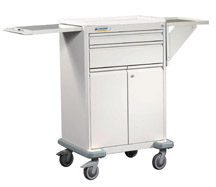 Procedure Cart Two Drawer, Two Door Standard features for the Preferred carts are: built in stabilizing base, combination side shelf/push handle, plastic top. Colors listed here are Quick Ship colors. Other standard and custom colors available. Procedure Cart, 2-Drawer/2-Door, Autumn White, 43"H x 22"L x 26.5"W, Drawers: (1) 3" Drawer, (1) 6" Drawer, 20" Doors w/1 adjustable pull-out shelf. Accessories