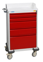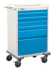 Emergency Cart, Five Drawer, Tall Shell Standard features for the Preferred carts are: built in stabilizing base, combination side shelf/push handle, plastic top. Colors listed here are Quick Ship colors. Other standard and custom colors available. Emergency Cart, 5-Drawer/Tall Shell, Red or Blue, 43"H x 22"L x 26.5"W, Drawers: (2) 3" Drawers, (2) 6" Drawers, (1) 12" Drawer, Key Lock or Tamper-Proof Seal. Accessories |