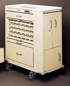 Unit Dose Medication Cart, 43"H x 22"D x 34"W, Patient Bin Size 2 1/2"H x 3 1/2"W x 11"L, Includes Waste Receptable & Storage Cabinet, Narcotic Box For 12" Drawer, (1) 3" Drawer, (1) 6" Drawer & (1) 12" Drawer 2900C Locking Narcotic Box, Autumn White. Accessories