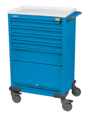 Standard features for the Preferred carts are: built in stabilizing base, combination side shelf/push handle, plastic top. Colors listed here are Quick Ship colors. Other standard and custom colors available. Emergency Cart, 4-Drawer/Short Shell, Red or Blue, 35"H x 22"L x 26.5"W, Drawers: (2) 3" Drawers, (1) 6" Drawer, (1) 12" Drawer, Key Lock or Tamper-Proof Seal. Accessories |